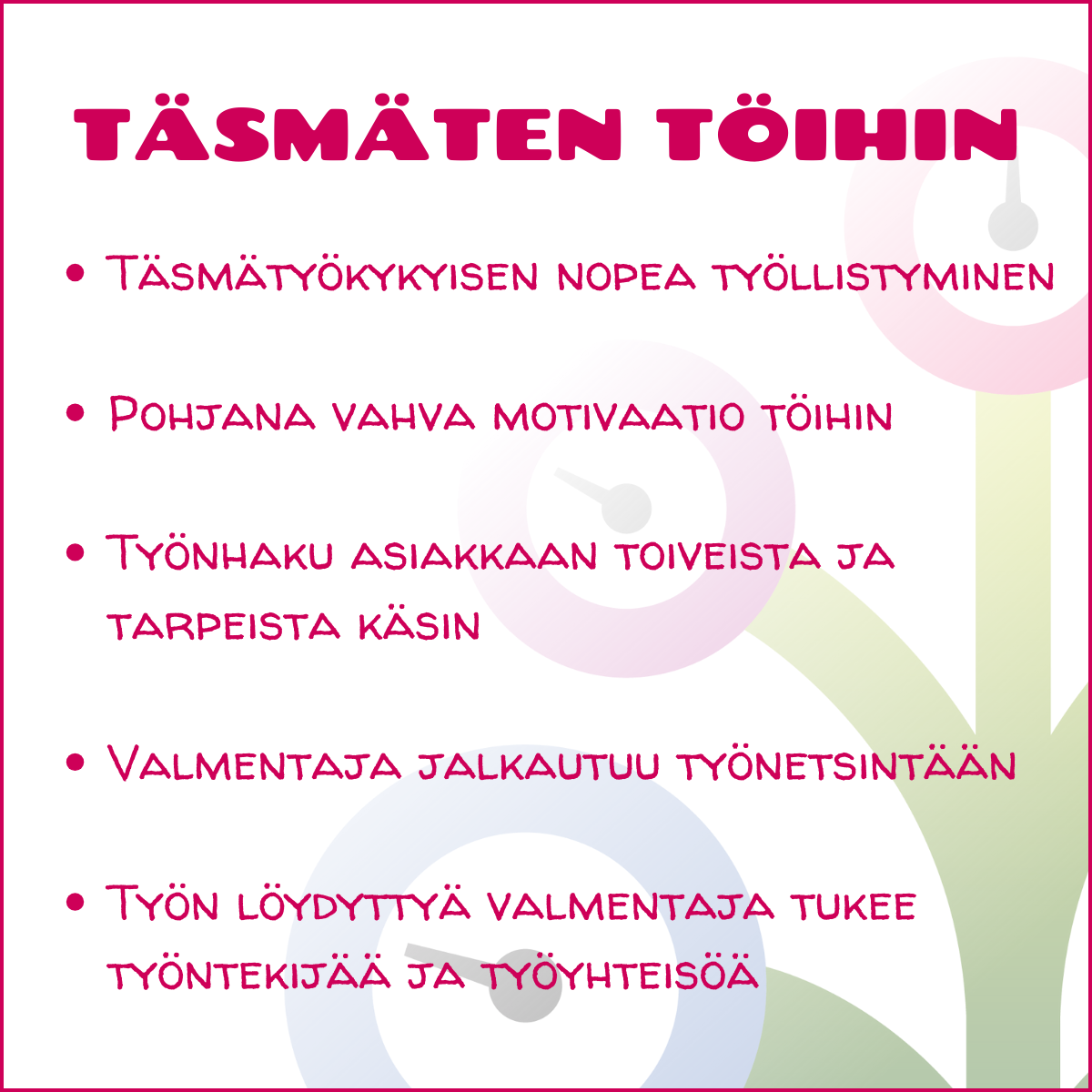 Täsmäten töihin -palvelussa keskeisinä tekijöinä ovat asiakkaan vahva motivaatio työllistyä sekä nopea työnhaun aloitus. Palveluun ohjataan jyväskyläläisiä asiakkaita, joilla on alentunut työkyky, mutta sitä on edelleen jäljellä varsinkin kun työtehtävät ja -olosuhteet on räätälöity hänen tarpeidensa mukaan. Asiakkaiden työkykyyn liittyvät asiat on selvitetty palvelun alkaessa, jotta valmentaja ja asiakas voivat keskittyä työnhakuun ja työssä pysymiseen.