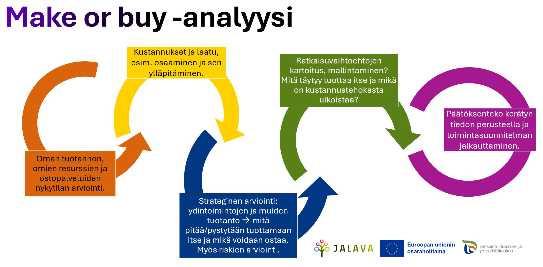 Jalava-hanke on tutustunut make or buy -analyysiin, koska se on tällä hetkellä erittäin ajankohtainen tulevien työllisyysalueiden miettiessä omia palvelujaan ja niiden tuottamistapaa. Olemme Keski-Suomen työllisyysalueiden kumppanina pohtimassa eri vaihtoehtoja sekä auttamassa niiden kokeiluissa muun muassa arvioimalla ja analysoimalla vaikuttavuutta.
