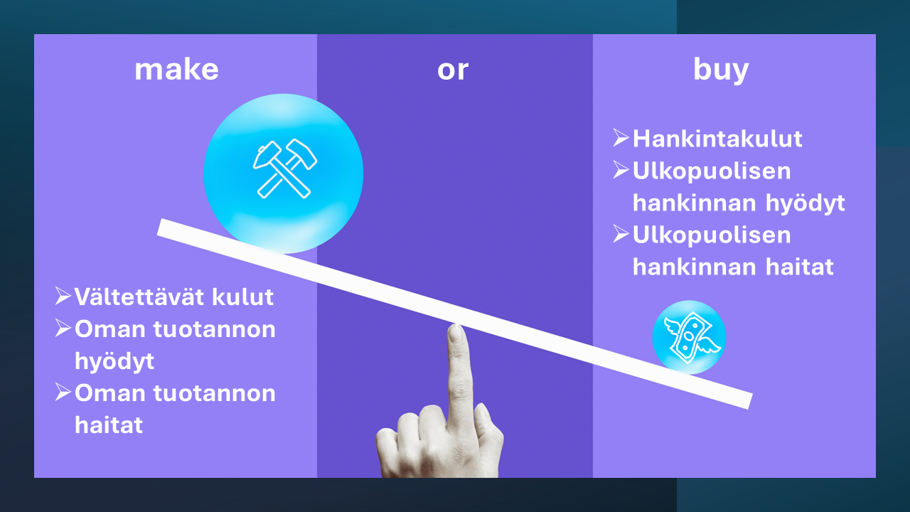 Mitkä ovat edellä mainittujen asioiden kustannukset? Ovatko tuotteet tai palvelut laadukkaita? Suorat kustannukset ja hyödyt on helpompi laskea, mutta tulee myös miettiä, mitä toiminnon ja osaamisen ylläpito maksaa. On tärkeä miettiä myös laatua eli saataisiinko ostettuna laadukkaampaa vai toisinpäin, ja ottaa huomioon myös eettiset näkökulmat.