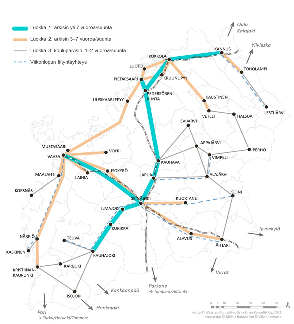 Etelä-Pohjanmaan ELY-keskus on määrittänyt toimivalta-alueensa Etelä-Pohjanmaan, Pohjanmaan ja Keski-Pohjanmaan joukkoliikenteen palvelutasotavoitteet vuosille 2023–2027 vuorovaikutuksessa alueen kuntien kanssa. Palvelutasomäärityksen tavoitteena on kuvata millaista palvelutasoa tavoitella ottaen huomioon alueen asukkaiden liikkumistarpeet, valtion ja kuntien tavoitteet, markkinaehtoisen liikenteen tarjonta ja Etelä-Pohjanmaan ELY-keskuksen määrärahakehys.
