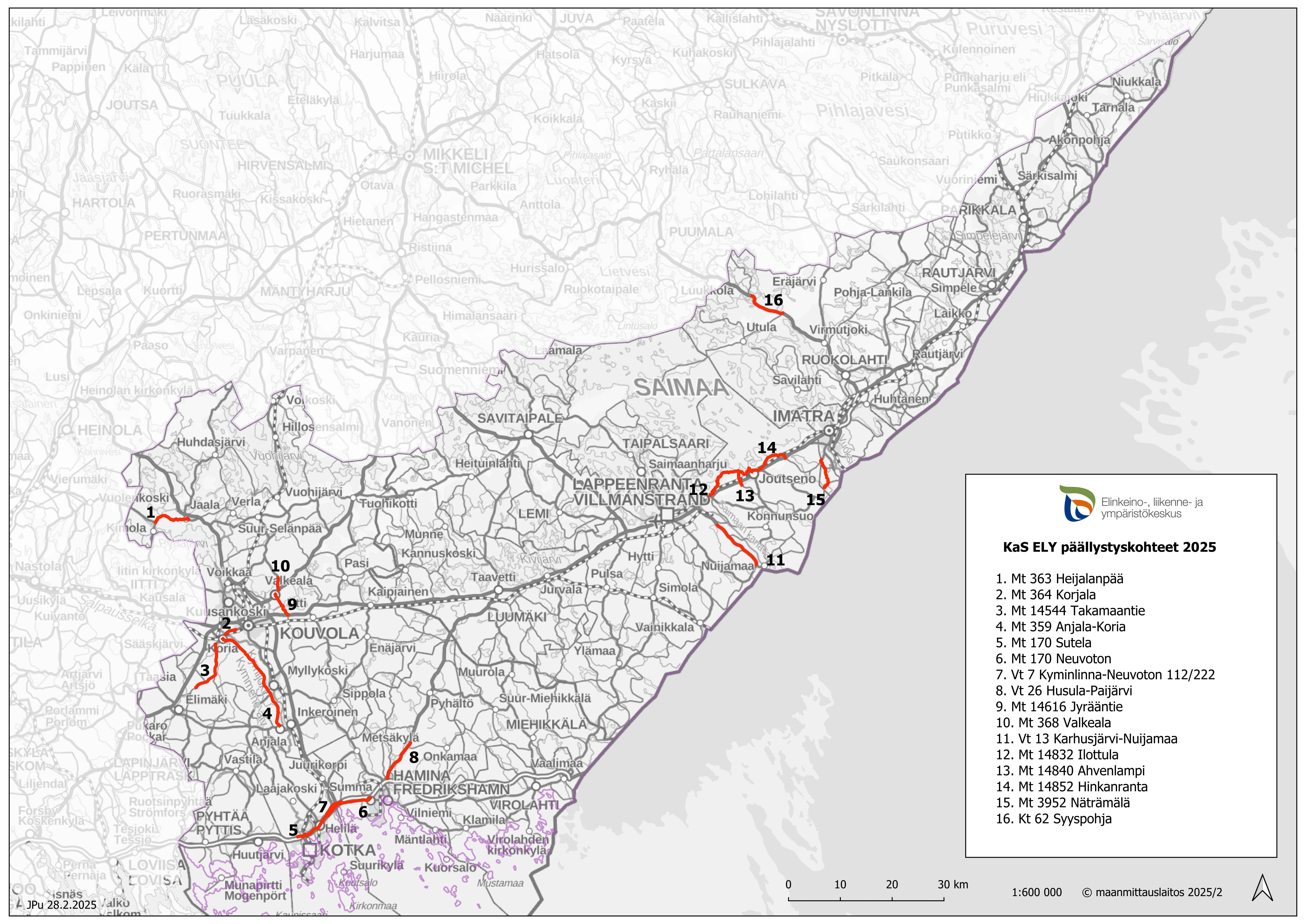 Hallituksen myöntämän korjausvelkarahoituksen turvin Kaakkois-Suomen päällystysohjelma on kokonaisuudessaan n. 129 ajoratakilometriä ja jalankulku- ja pyöräilyväyliä päällystetään n. 5 km verran. Kilpailutettujen päällystyskohteiden lisäksi vuoden mittaan tehdään päällystepaikkauksia ja mahdollisesti joitain yksittäisiä lyhyitä päällystyksiä. Vuoden 2025 päällystyskohteet ovat katsottavissa tämän sivun lopussa olevasta ”oikopolut” -linkistä. Laajamittaisten päällystystöiden lisäksi tieverkolla tehdään erinäisiä päällyste- ja urapaikkauksia liikennöitävyyden turvaamiseksi. Lisätietoja työnaikaisista liikennejärjestelyistä ja liikennetilanteesta saat Fintrafficin liikennetilannekartalta, joka löytyy ”muualla verkossa” -linkeistä.