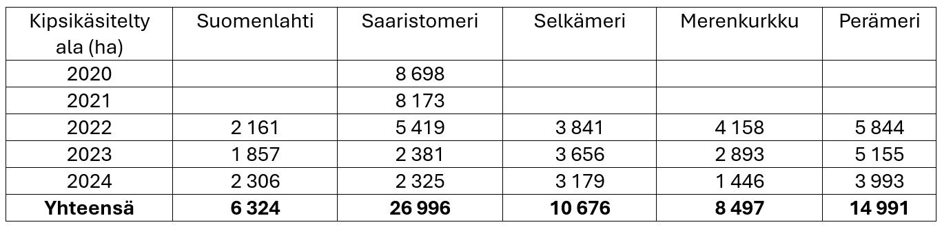 Taulukko 1 Kipsikäsitelty ala merialueittain vuosien 2020–2024 välisenä aikana. KIPSI-hanke käynnistyi vuonna 2020 Saaristomeren valuma-alueella ja laajeni Saaristomeren ulkopuolisille merialueille vuonna 2022.