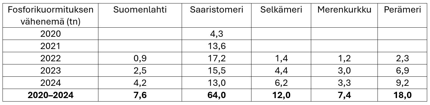 Taulukko 2 Kipsinlevityksen aikaansaama merialuekohtainen fosforikuormituksen vähenemä vuosien 2020–2024 välisenä aikana. Saaristomeren valuma-alueen levitykset alkoivat vuoden 2020 aikana. Muiden merialueiden levitykset alkoivat vuonna 2022.