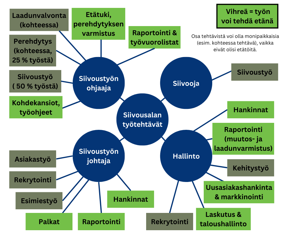 Etätyönä tehtäviä työtehtäviä on kuitenkin olemassa myös siivousalalla! Etänä voi tehdä esimerkiksi työohjeita, raportointia, työvuorolistoja ja hankintoja. Syy siihen, miksi etätyöt eivät kuitenkaan ratkaise työvoimapulaa esimerkiksi lisäämällä alan houkuttelevuutta tai poistamalla paikkasidonnaisuutta, liittyy etätöiden luonteeseen. Käytännössä kaikki työtehtävät, joissa etätyö on mahdollista liittyvät esimiestyöhön tai hallinnollisiin tehtäviin. Meillä on kuitenkin pulaa juuri siivoojista, ja käytännön siivoustyötä ei oikein voi tehdä etänä.