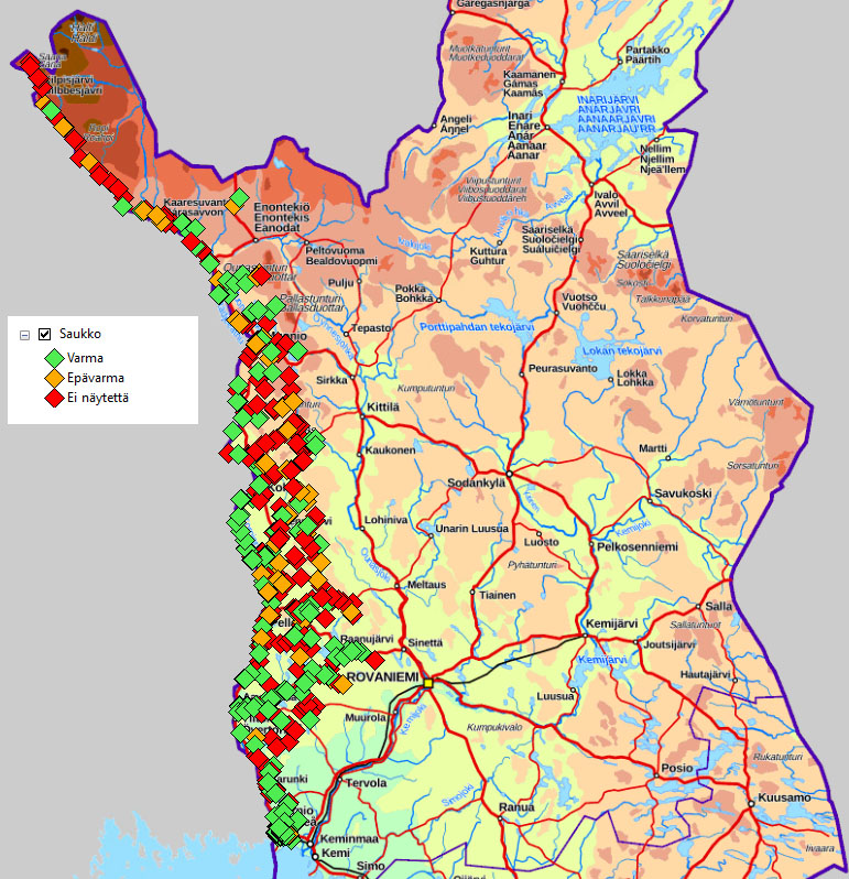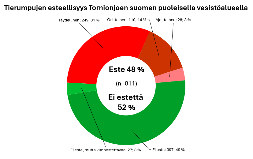 Vuoden 2024 syksyyn mennessä kartoitettujen tierumpujen vaellusesteellisyys vesieliöille Tornionjoen suomen puoleisella vesistöalueella Triwa LIFE:n ja SAKTI-järjestelmän tietojen mukaan.