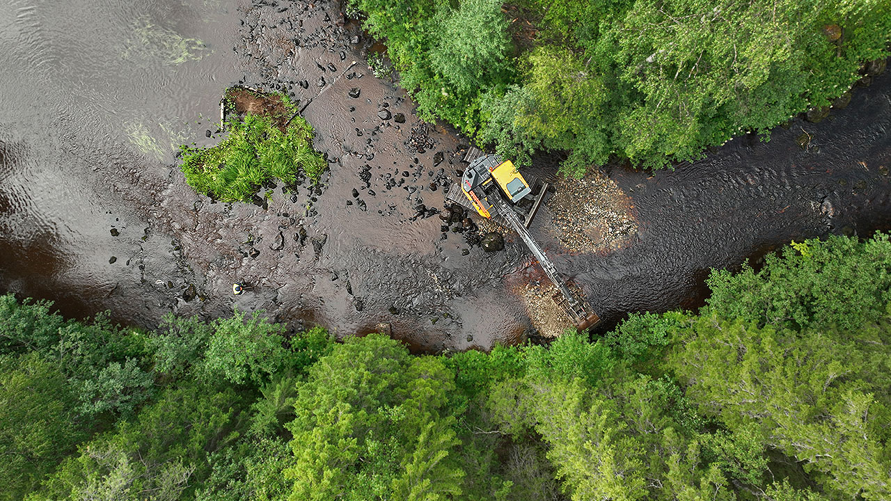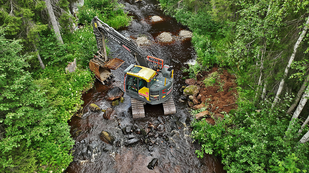 Kaivinkone kunnostaa Olosjoen Suukoskea Pellossa kesällä 2024. Kuva: Sihveri Ervasti