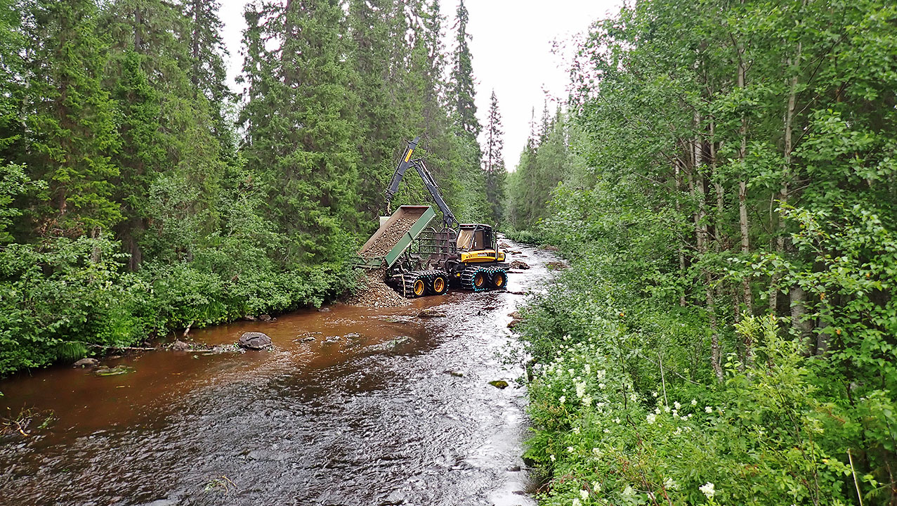 Metsätraktori kuljettaa kutusoraa uomaan odottamaan. Sorat lisätään kaivinkoneella kunnostuksen yhteydessä oikeille paikoille. Kuva: Teemu Partanen