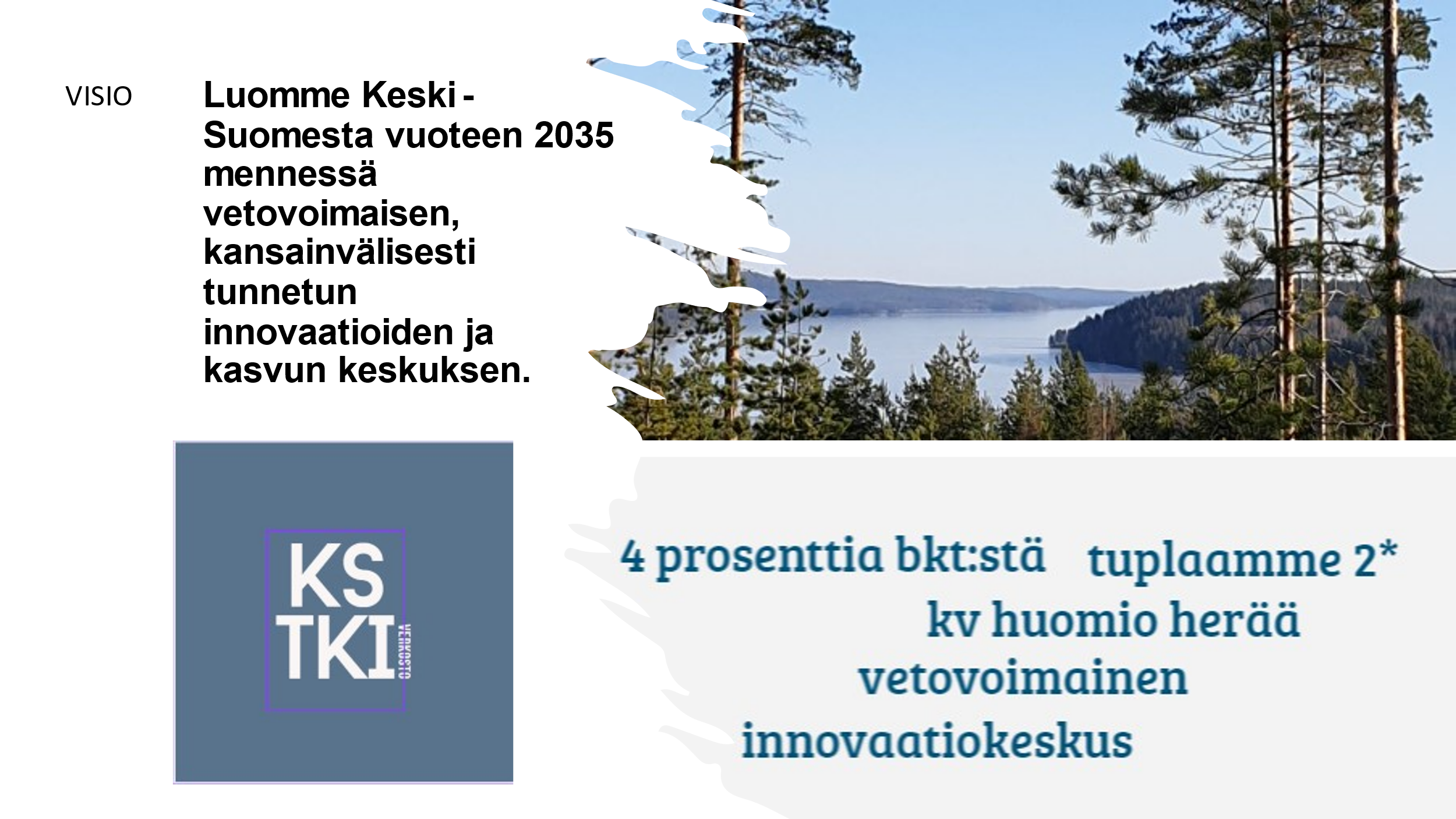Keski-Suomen TKI-työn visio: Luomme Keski-Suomesta vuoteen 2035 mennessä vetovoimaisen, kansainvälisesti tunnetun innovaatioiden ja kasvun keskuksen.